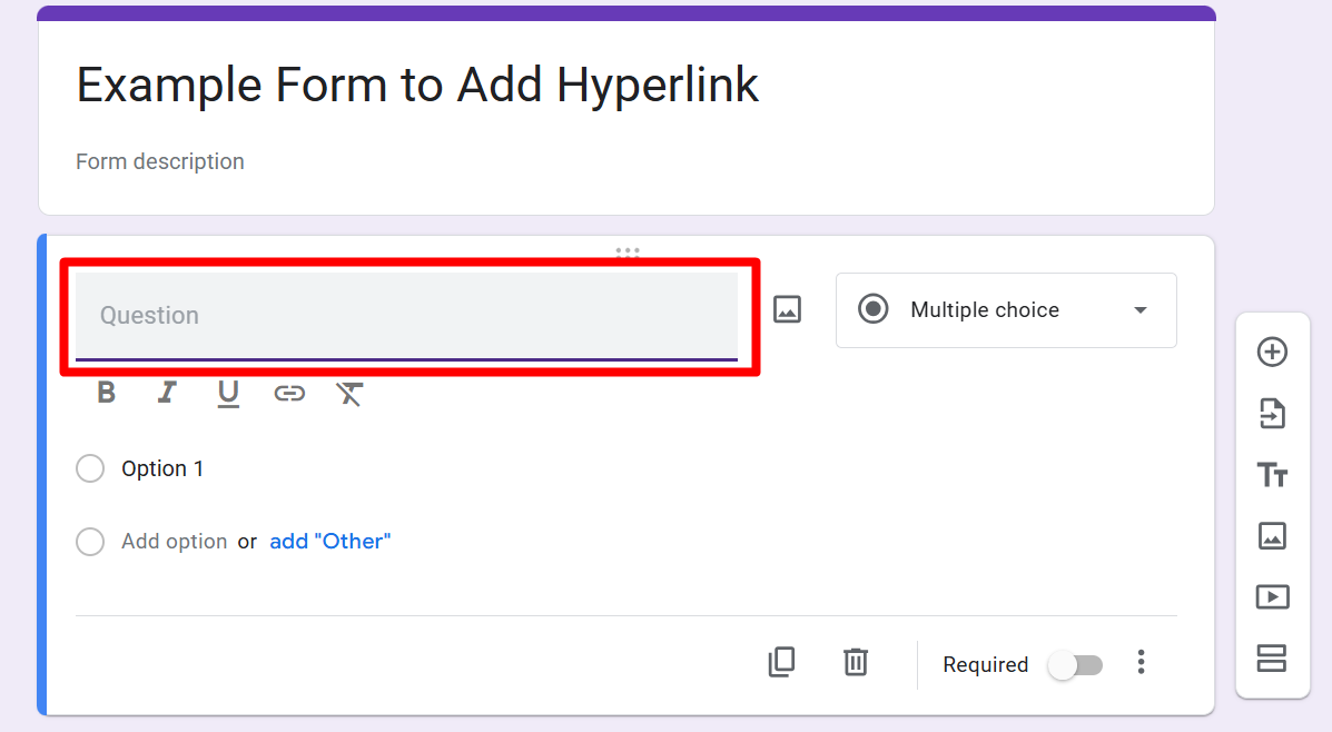Click into the text area where you want the hyperlink. It could be the form title, description, or a question field. For example, I want to add a hyperlink to the question, that's why I click on the question field. Check the screenshot below⬇️