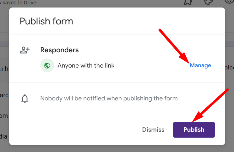 If you want to give editing access to any other person, then click on ‘Manage’. If not, then directly click on ‘Publish’ in the pop-up. Your form will publish automatically.