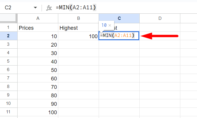Similarly, to find the minimum value in your data set, use the MIN function.