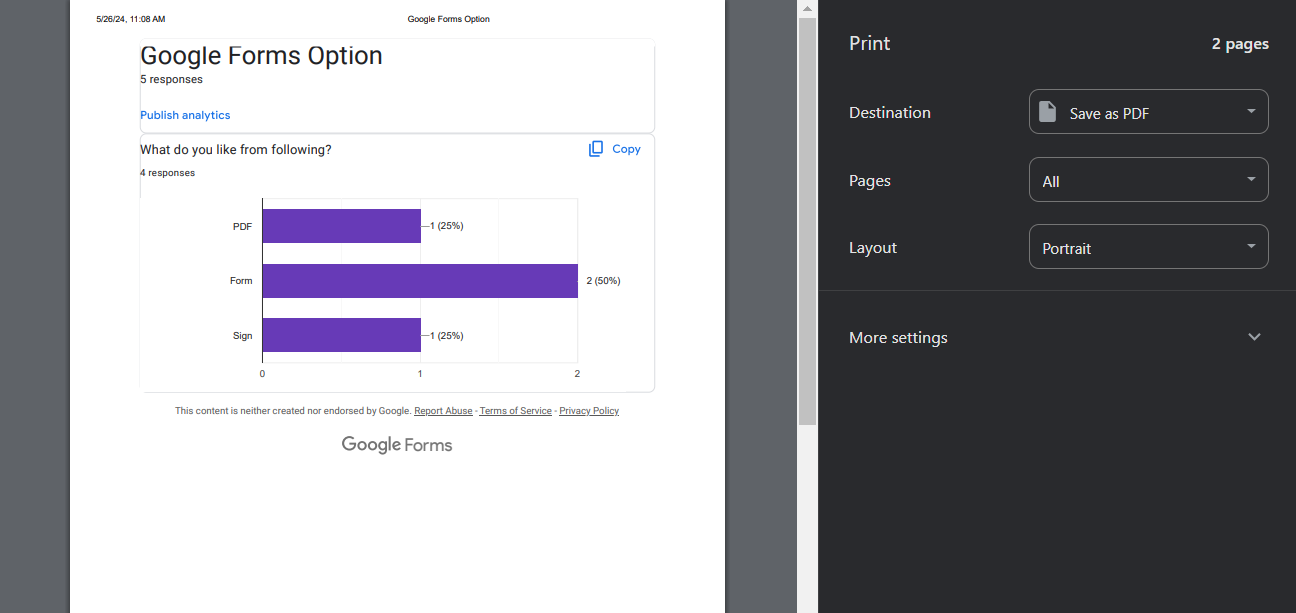 If you need to distribute paper copies of your Google Form, perhaps for audiences who prefer not traditional online formats—like students or attendees of a workshop—you can convert the entire form into a PDF.