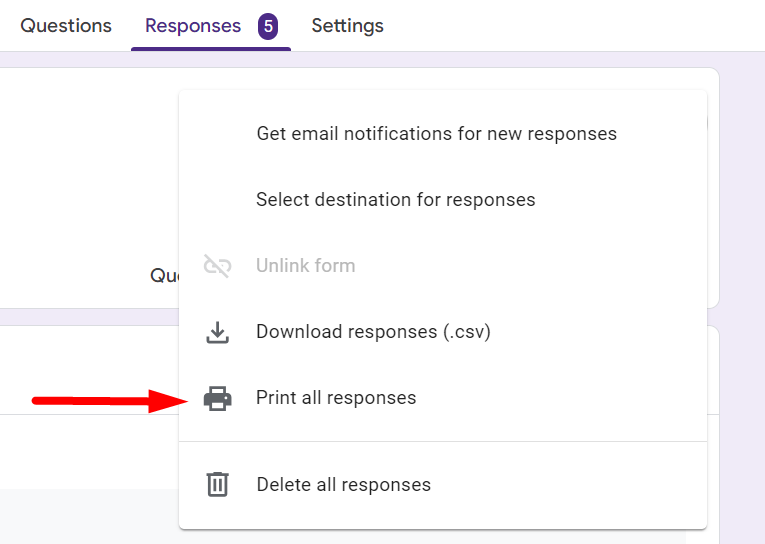 In the responses tab, click on the three dots right beside the Google Sheet “Link to Sheets” icon.