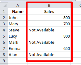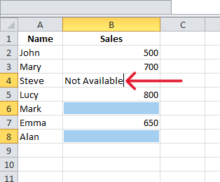 Once the blank cells are selected, you can enter the value you want to fill the blank cells with. For example, if you want to enter "Not Available", type it in the active cell (highlighted in white).
