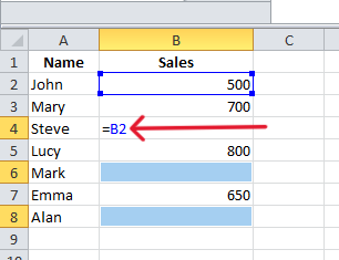 If you prefer to fill blank cells with formulas, such as referencing the cell above, type the formula in the active cell. For example, type =B2 to copy the value from the cell above. Hold down the Ctrl key and press Enter to apply the formula to all blank cells.