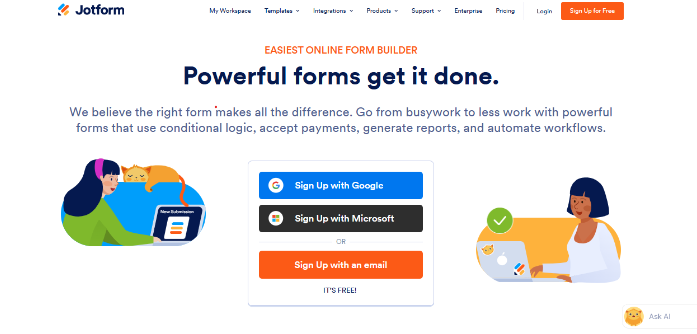 Jotform is a no-code form builder that helps you create online forms for anything from surveys to sign-ups and event registrations. It’s packed with features like drag-and-drop fields, integrations with apps like Google Sheets and PayPal, and tools for collecting payments and automating workflows.