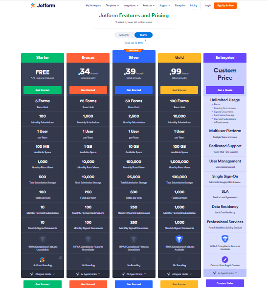 Jotform pricing follows a freemium-to-enterprise model, offering options for individuals, small teams, and large organizations. The Starter plan is free but heavily limited in forms, submissions, and storage. Paid plans begin at $34/month (billed annually) for Bronze and go up to $99/month for Gold, which includes features like HIPAA compliance and higher submission limits.