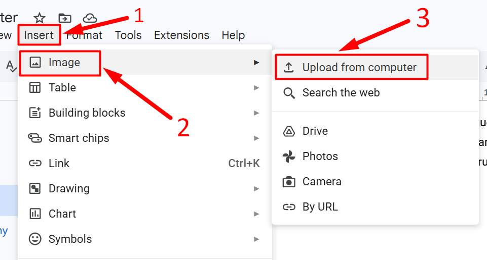 Click Insert → Image → Upload from computer