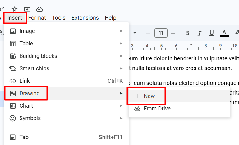 Step 2: Click on Insert → Drawing → + New